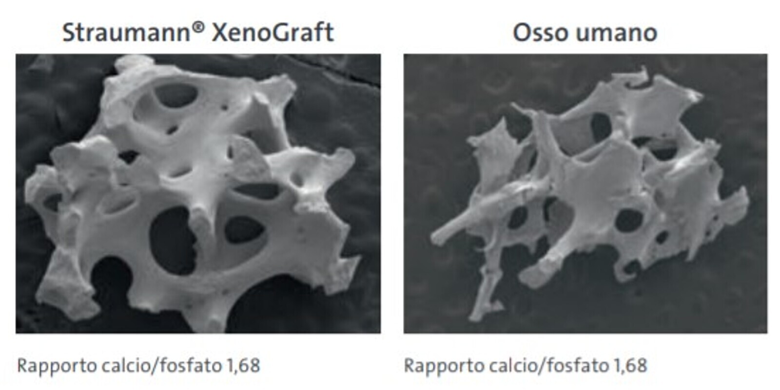 Straumann XenoGraft, per il trattamento dei difetti ossei, viene rigorosamente ricavato da osso bovino ampiamente testato per eliminare l’antigenicità e fornire un ambiente favorevole alla crescita di nuovo osso. Il tasso di riassorbimento limitato consente di ottenere una maggiore stabilità, un vantaggio importante nei casi che richiedono una struttura solida per il supporto tissutale a lungo termine o per esigenze estetiche.