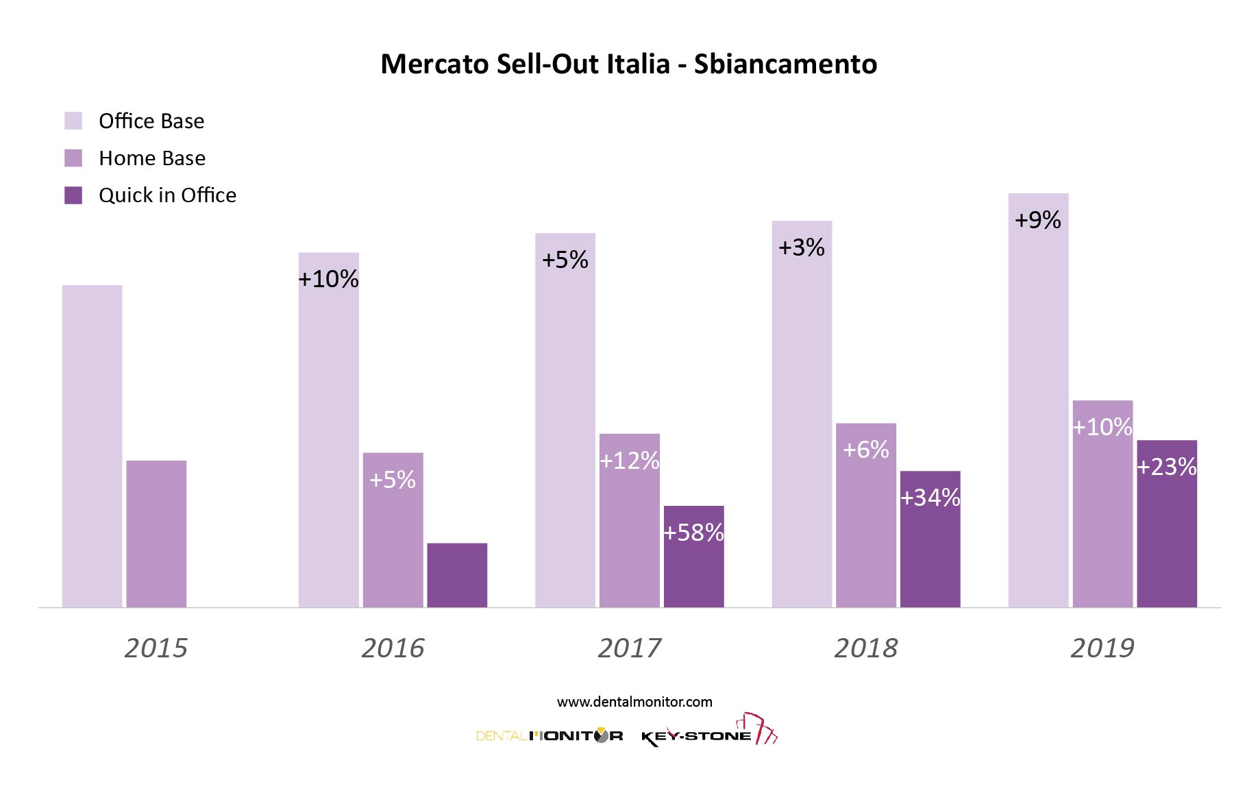In definitiva BlancOne Click risulta essere non soltanto un trattamento sbiancante, ma anche un efficace strumento di marketing per lo studio dentale, in grado di attirare nuovi pazienti, di fidelizzarli e di creare nuove opportunità per un’odontoiatria la cui domanda è sempre più orientata verso fattori estetici e di benessere. I dati del mercato italiano parlano chiaro. Secondo la Sell-Out Analysis realizzata da KeyStone, che ha creato un’apposita categoria di sbiancamento “Quick in Office”, BlancOne Click sta creando un mercato del tutto nuovo e in forte crescita rispetto alle soluzioni di sbiancamento tradizionali (Grafico 4).