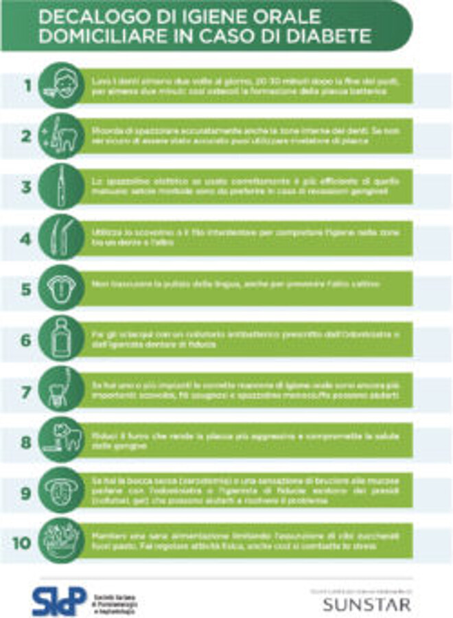 Imprescindibile diventa, durante la visita, la compilazione del questionario redatto da SiDP e in dotazione allo specialista, per poter classificare il paziente nella casistica a “rischio negativo” o a “rischio positivo” e la consegna al paziente del decalogo SiDP sul diabete e la parodontopatia (Fig.1) L’odontoiatra, dal canto suo, deve informare il paziente parodontale del maggior rischio di sviluppare la malattia diabetica inserendolo in un programma di monitoraggio di prevenzione secondaria. Ogni paziente, sia con diagnosi nota di diabete, sia con patologia non ancora individuata, deve essere seguito attraverso protocolli clinici personalizzati e indirizzati ad effettuare screening diabetologici al riconoscimento di chiari sintomi, dopo la presa visione del profilo glicemico e lipidico da esami ematici recenti. Sarà certamente molto importante fornire ai pazienti il decalogo redatto dalla SIdP sul diabete e la parodontite (Fig.1) con le dieci regole di igiene orale che dovrebbero osservare i pazienti diabetici.