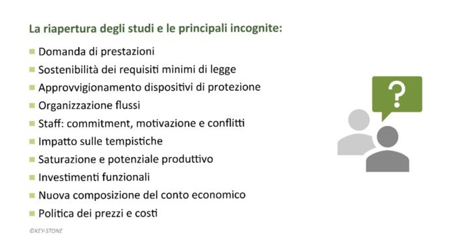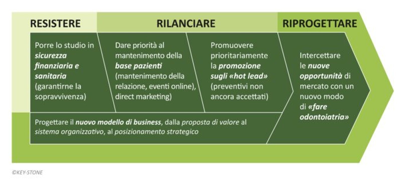 Il paradigma della riapertura: resistere, rilanciare e riprogettare È fondamentale accettare il fatto che non ritroveremo più l’odontoiatria che abbiamo lasciato a marzo: il sistema organizzativo sarà diverso, i pazienti saranno diversi e certi costi aumenteranno. Se non si passa attraverso l’accettazione di questo cambiamento sarà difficile questo vero e proprio “reset” dell’attività odontoiatrica.