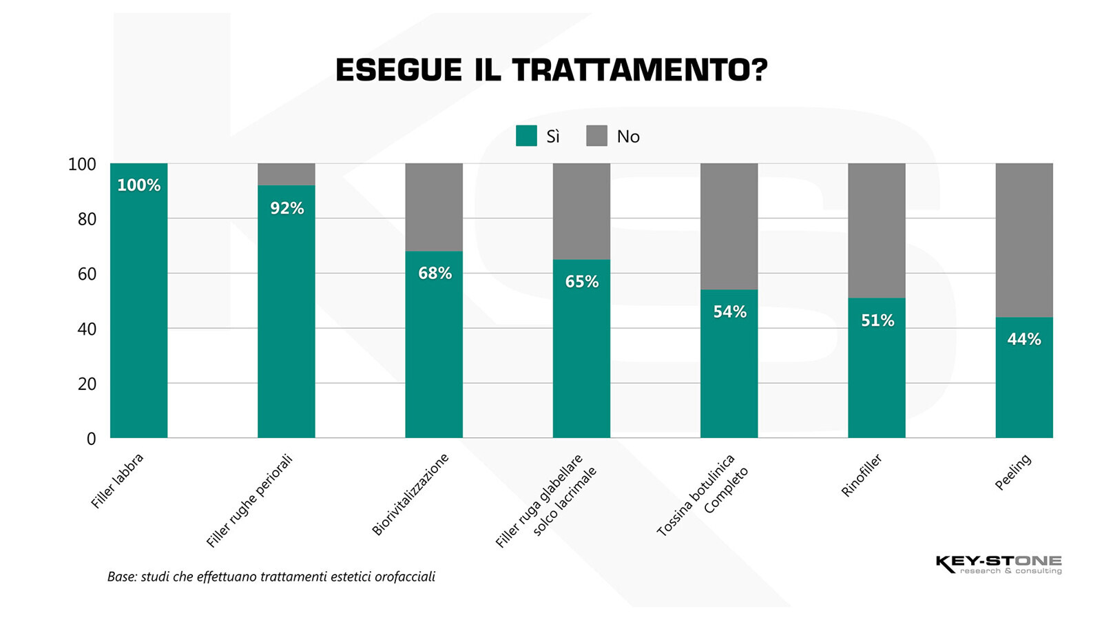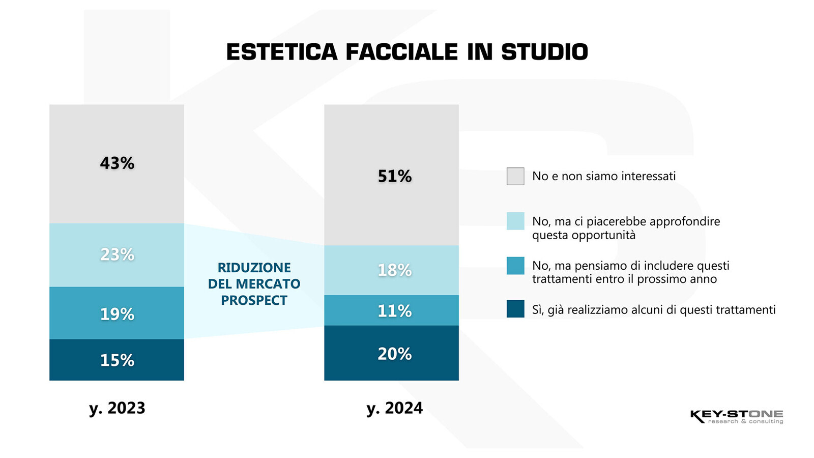 La recente conversione in legge del DL Bollette (decreto-legge 30 marzo 2023, n. 34) ha ridefinito le modalità di esercizio della medicina estetica, consentendo agli odontoiatri di eseguire trattamenti estetici non invasivi o mininvasivi su tutto il viso. Questo cambiamento normativo ha aperto nuove opportunità per il settore odontoiatrico, ma qual è l’effettiva propensione dei dentisti italiani a integrare tali trattamenti nella loro offerta? In KEY-STONE abbiamo effettuato una ricerca in due fasi (luglio 2023 e autunno 2024) per monitorare l’interesse degli studi dentistici in questa disciplina. Dalle interviste condotte nel 2023 sul panel di titolari di studi odontoiatrici KEY-STONE (un campione di 400 studi) il 15% dei partecipanti all’indagine ha dichiarato di eseguire già alcuni di questi trattamenti, sia pur in modo occasionale e a volte supportati da medici specializzati in questo ambito, e un ulteriore 19% aveva in programma di integrare tali trattamenti nel prossimo futuro.
