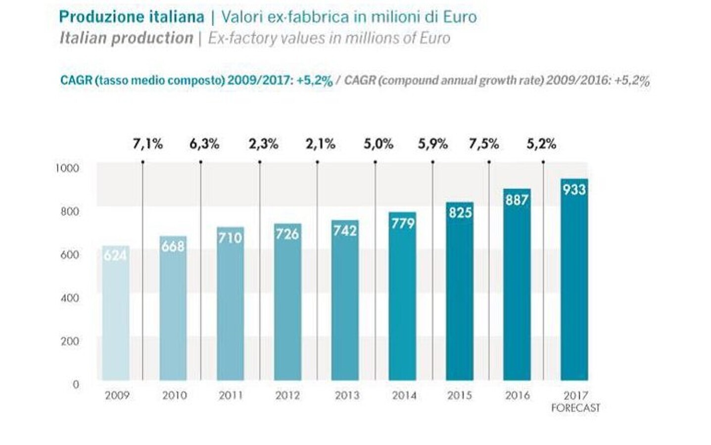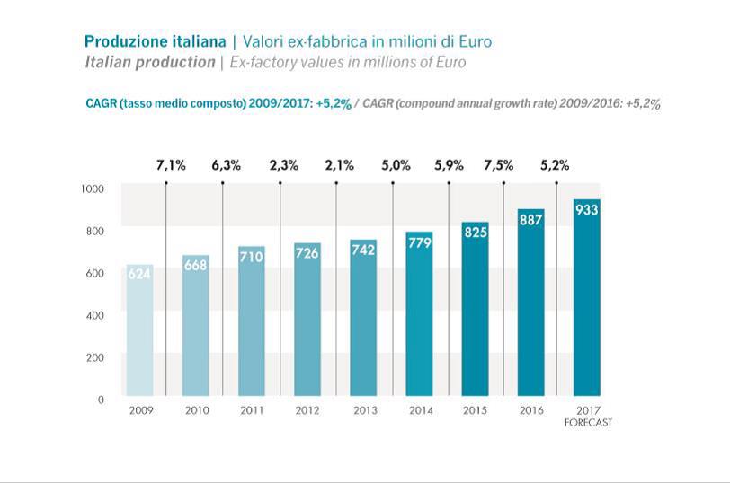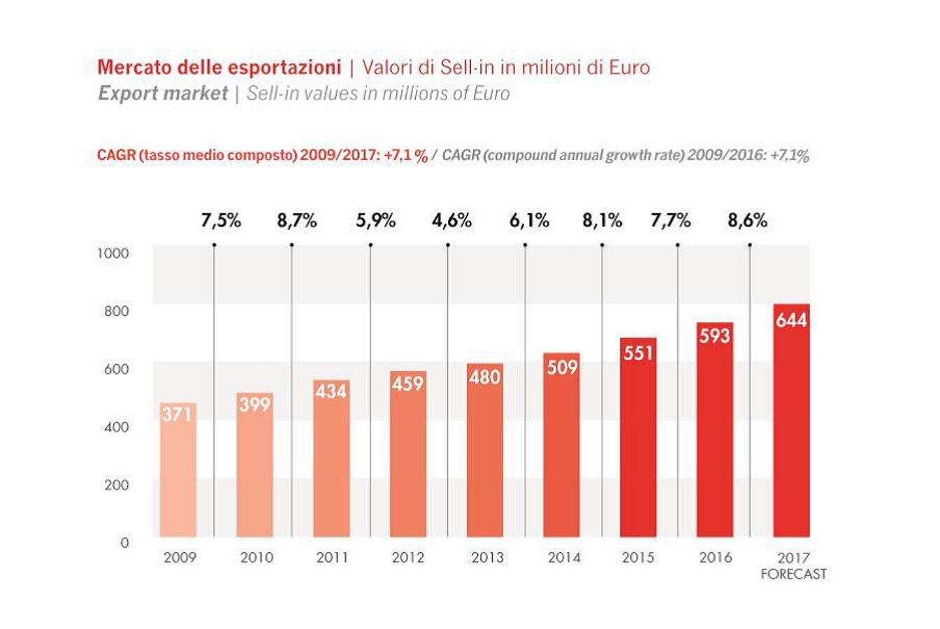 Esportazioni quasi raddopiate in 10 anni Visti gli andamenti altalenanti e sostanzialmente stagnanti della domanda interna, è stato l’export a sostenere il comparto. Il settore è quasi raddoppiato con un aumento del 75%, passando da 370 milioni nel 2009 a quasi 650 milioni nel 2017. Si registra un elevato tasso di crescita medio composto pari al 7,1% all’anno.