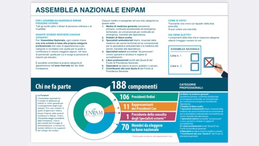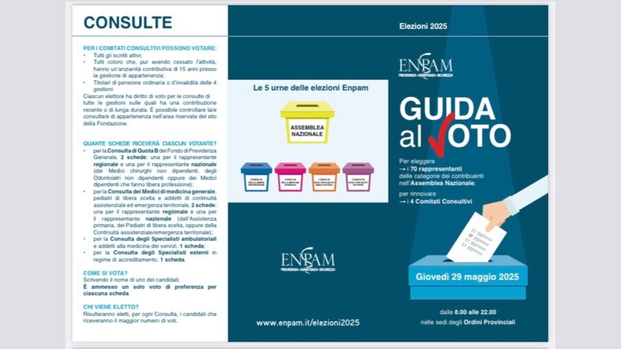 Sulla base del nuovo statuto, l’ENPAM ha dato il via alle procedure elettorali il 29 maggio 2025 che porteranno al rinnovo dell’Assemblea nazionale e del collegio sindacale. Nel primo appuntamento, fissato per giovedì 29 maggio 2025, dalle 8:00 alle 22:00, i medici e gli odontoiatri saranno chiamati a votare presso i propri Ordini di appartenenza, i 70 rappresentanti delle categorie dei contribuenti ad elezione diretta dell’Assemblea nazionale e per rinnovare i 4 comitati delle Consulte delle varie gestioni previdenziali (libera professione, medicina generale, specialistica ambulatoriale e specialistica esterna).