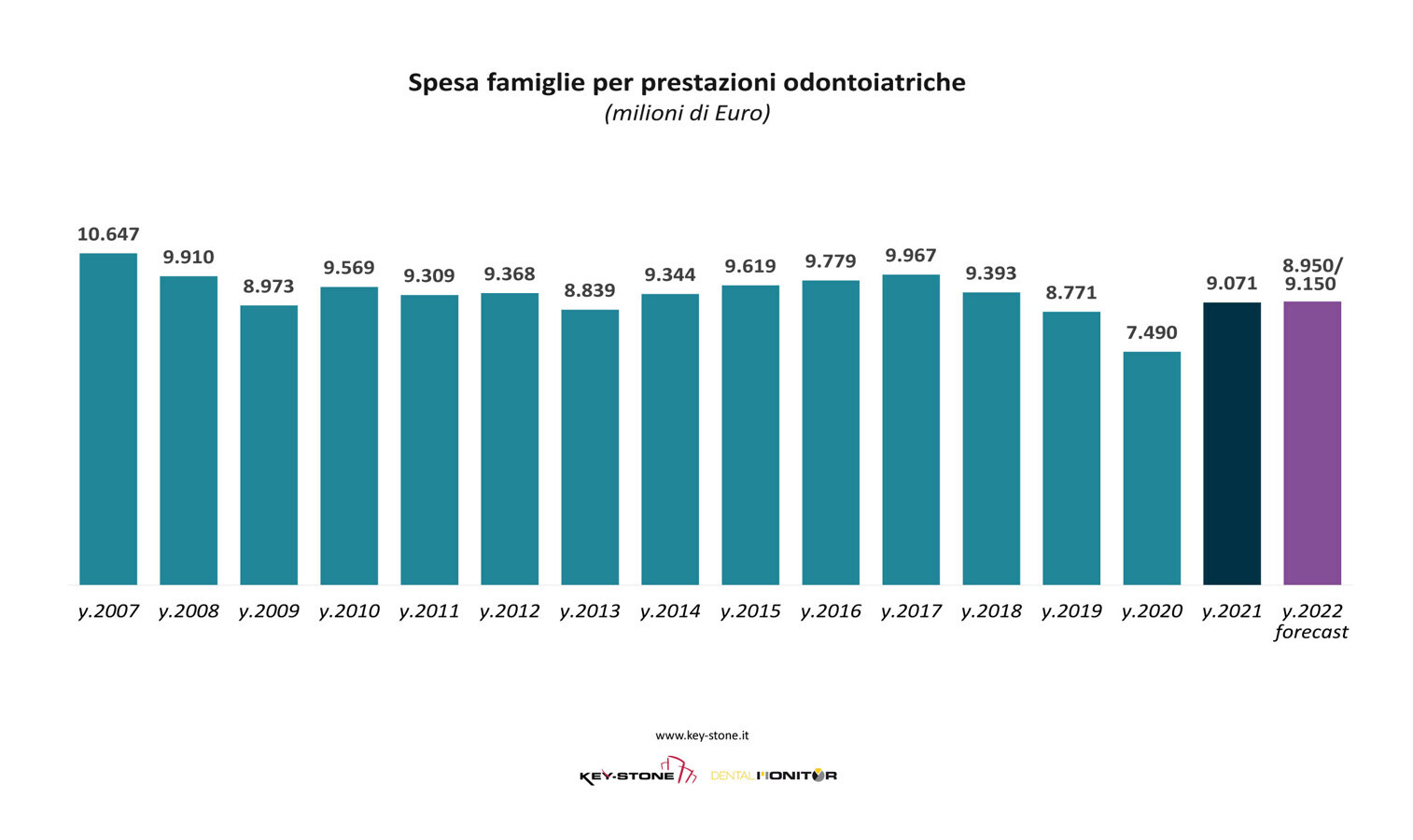 Era grande l’ottimismo alla fine del 2021 anche in odontoiatria, dopo un terribile 2020, l’anno successivo aveva fatto registrare un enorme aumento di pazienti e di ricavi, che in molti studi dentistici avevano superato i valori del 2019. Forse con un eccesso di ottimismo, si era erroneamente immaginato che tutto quanto perduto fosse già stato recuperato, ma le cose non stanno esattamente così e, secondo le prime proiezioni Key-Stone, nemmeno il 2022 ha consentito di recuperare completamente la spesa odontoiatrica persa nel 2020.