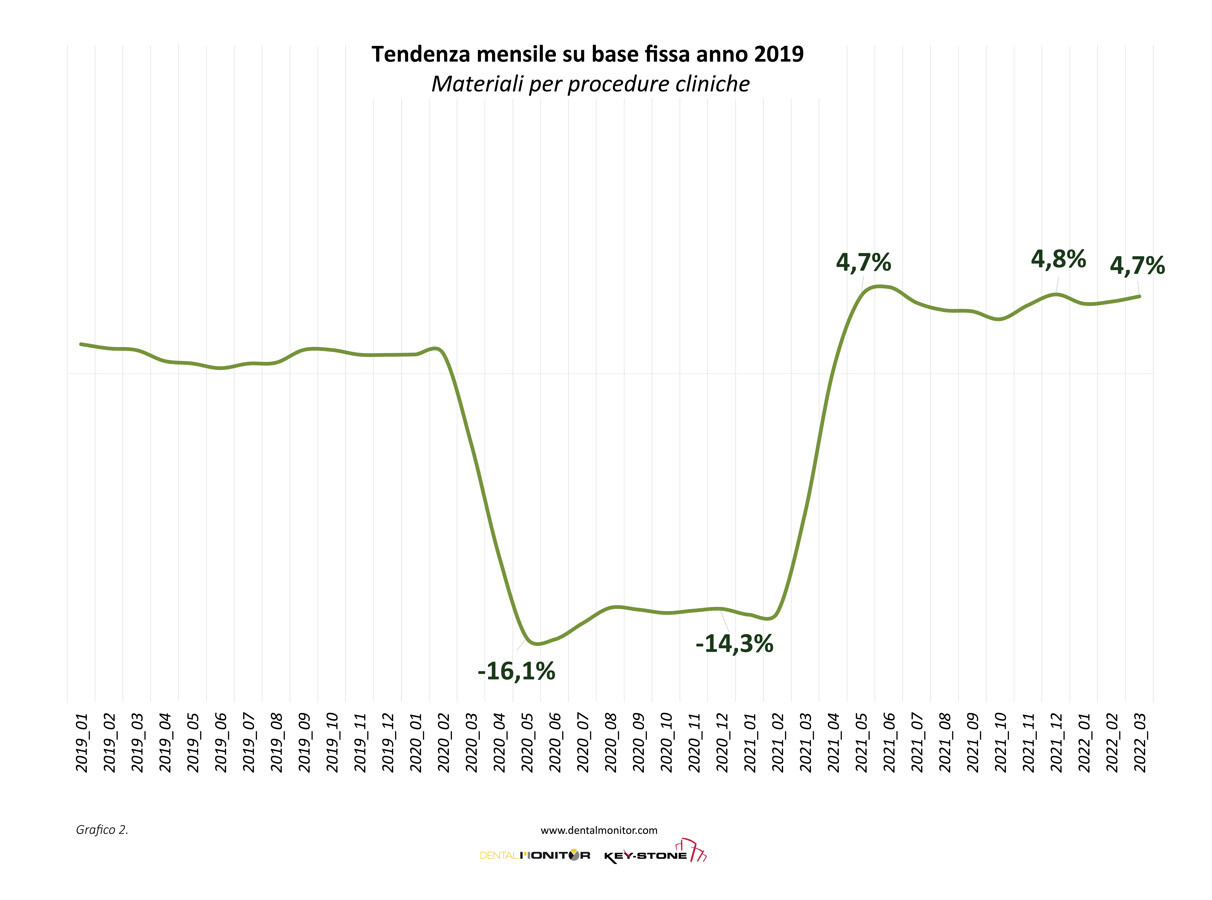 Passiamo ora a una visione di più ampio respiro, osservando l’andamento dei consumi di questi materiali a partire dal 2019, un anno che viene utilizzato come “base fissa” per analizzare il recupero effettivo dei consumi dei dentisti italiani.