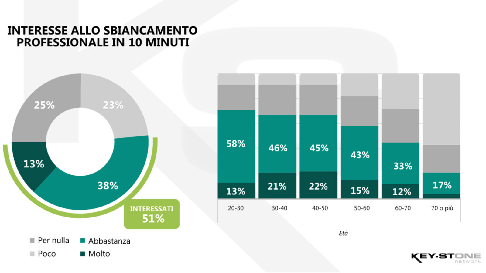 Data l’elevata propensione degli italiani a effettuare sedute di igiene orale (quasi 7 pazienti su 10 che vanno dal dentista la effettuano almeno una volta all’anno) abbiamo poi voluto indagare l’interesse a sottoporsi a uno sbiancamento professionale dei denti in soli 10 minuti alla poltrona dopo l’igiene dentale.