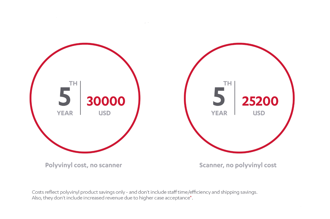 Confronto del costo del polivinile rispetto al costo dello scanner. Il risparmio sui costi riflette il risparmio sul solo polivinile. Non include il tempo del personale, l’efficienza, i risparmi sulle spedizioni o l’aumento delle entrate dovuto ad una maggiore accettazione dei casi. Il calcolo della compensazione dei costi è solo un esempio