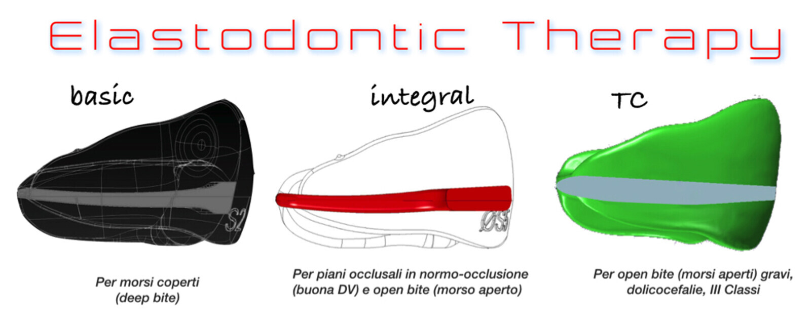 Sono dispositivi realizzati con un materiale termoplastico, certificati e biocompatibili con le mucose della bocca. La particolare miscela degli elastodontici consente di mantenere una forma rigida ma nello stesso tempo elastica procurando una piacevole sensazione di benessere, ecco perché nella maggior parte delle malocclusioni soprattutto nei pazienti molto piccoli, il loro utilizzo è considerato piacevole. Esistono in diverse forme, misure e diversi piani di masticazione.