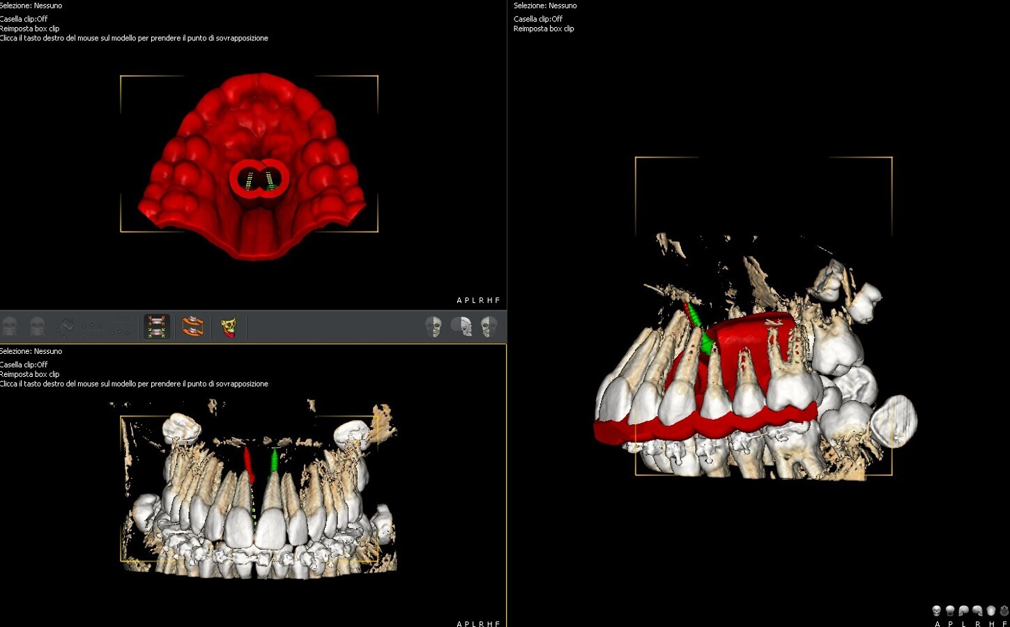 In questo stadio la fusione della sutura è già avvenuta parzialmente o totalmente, ed è quindi stata eseguito una MARPE. È stata progettata una dima CAD/CAM, mediante protocollo Easy Driver5. La CBCT è stata sovrapposta alla scansione digitale STL (standard triangulation language) dell’arcata dentale superiore, per valutare con estrema precisione il sito più adatto di inserimento, la lunghezza e il diametro delle viti, rispettando la profondità della volta palatina, e l’inclinazione di inserimento delle viti (Fig. 4).