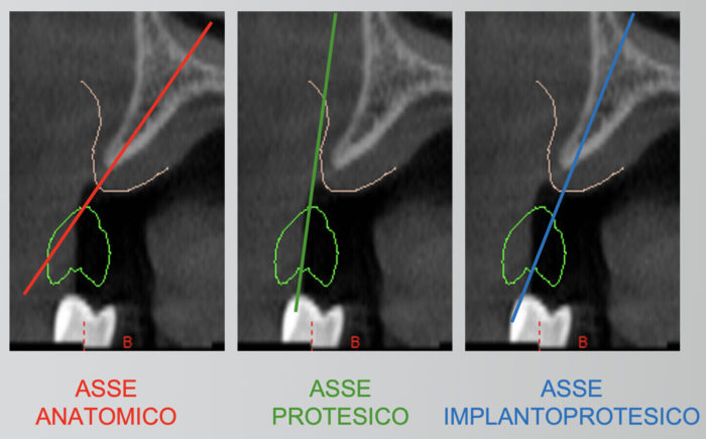 La pianificazione software della fase chirurgica e l’utilizzo di una guida per il corretto posizionamento dell’impianto “asse implantoprotesico”, (Fig. 2) ci permettono non solo di ottenere il posizionamento implantare nel rispetto dello spessore osseo disponibile “asse anatomico” ma anche di ricercare la migliore soluzione protesica avvitata, “asse protesico”, per una sensibile riduzione del rischio di errore. Interessante inoltre notare come con l’ausilio del software per progettazione implantoprotesica e utilizzando la riproduzione virtuale della ceratura diagnostica sia possibile allineare l’asse implantare all’elemento protesico in modo ottimale, utilizzando come riferimento il prolungamento dell’asse dell’impianto e facendolo emergere nella posizione ottimale al centro della corona protesica. In assenza di informazioni protesiche, come spesso succede, la posizione implantare suggerita dall’anatomia ossea non coincide poi con la posizione ideale per la protesi.