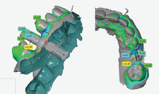 Oggi con la tecnologia digitale si sono raggiunti livelli di affidabilità e di precisione estremamente elevati. Con alcuni software utilizzati nell’industria meccanica per il Reverse Engineering è possibile mettere a confronto il progetto implantare (rappresentato dal colore grigio) con la posizione dell’impianto in situ, rilevata con REXmarker attraverso lo scanner intraorale a fine intervento. Questo software riesce a misurare l’errore tra il progetto iniziale e l’impianto inserito, dimostrando che il margine di errore è +/- 0,50 mm come rappresentato nella scala di misurazione colorimetrica (Fig. 11).