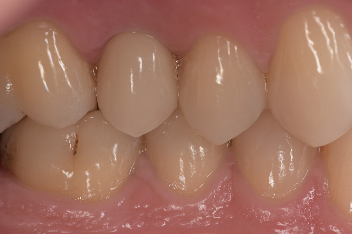 Gli spazi interstiziali tra la circonferenza corticale dell’impianto sono stati colmati con biomateriale a lento riassorbimento al fine di una miglior conservazione del bondle bone (Fig. 3) l’impianto non è stato volutamente protesizzato immediatamente perché nonostante la stabilità primaria raggiunta fosse di 55 ISQ (misurazione fatta con l’Ostell) abbiamo preferito lasciare l’impianto al naturale decorso clinico di guarigione non esponendolo a ulteriori traumi occlusali. Dopo 8 settimane abbiamo rimosso la vite di guarigione e preso un’impronta ottica digitale per la preparazione di un provvisorio posizionato su moncone specifico per ulteriori 4 settimane (Fig. 4), al termine del quale abbiamo nuovamente rimosso la corona provvisoria avvitata e constatato il grado di condizionamento mucoso perimplantare (Fig. 5) abbiamo rilevato una nuova impronta con scanner intraorale (TRIOS, 3Shape) mediante apposito scan body.