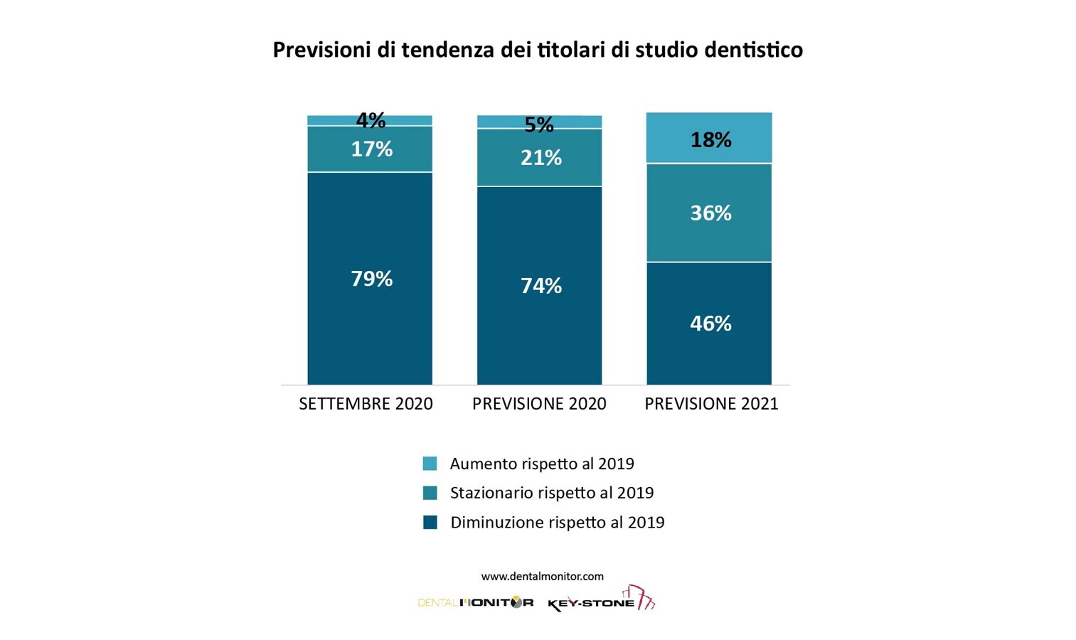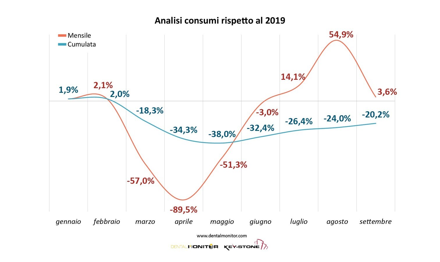 In assenza di dati certi relativi all’accesso alle cure odontoiatriche, Key-Stone realizza mensilmente un’analisi a breve termine, denominata "Recovery Analysis Italy", basata sulle vendite effettuate da un campione significativo di distributori (panel con un valore di vendita dei prodotti di consumo di oltre 500 milioni nel 2019). Si tratta di un monitoraggio congiunturale, realizzato per analizzare regolarmente e in modo affidabile l’andamento del settore e le relative fasi di ripresa.
