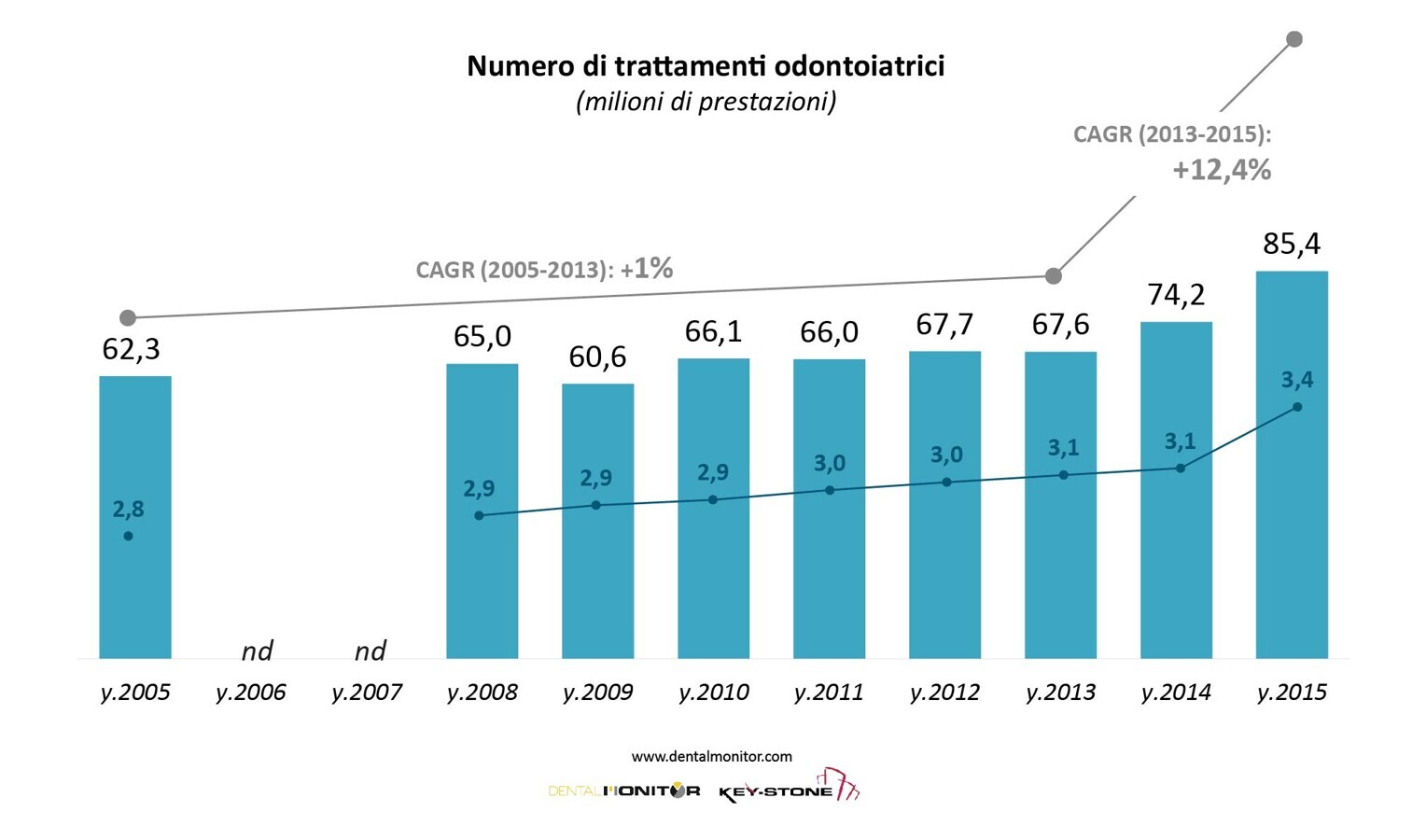 Per quanto alcuni elementi, in primis quelli economici, possano concorrere a una diminuzione degli accessi agli studi, in realtà l’assistenza odontoiatrica rientra nella sfera dei bisogni primari delle persone, portando a scelte di procrastinazione o diluizione nel tempo delle cure non urgenti (oltre ad altri fenomeni come scelta del preventivo minore, ricorso al credito, ecc.), ma difficilmente si rilevano significativi e duraturi cambiamenti della domanda.