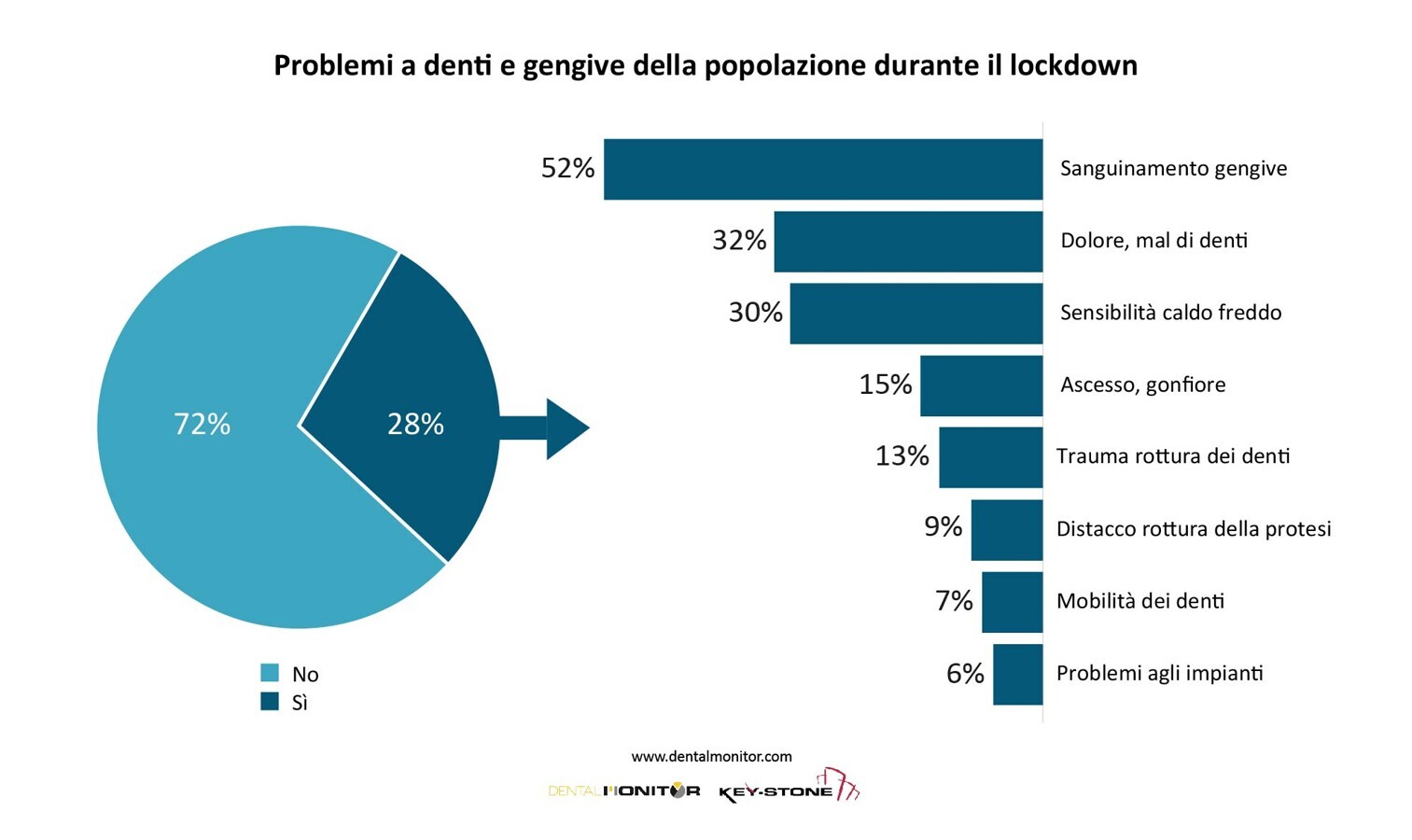 Il ruolo sociale e fondamentale del sistema odontoiatrico come servizio per l’intera comunità e la necessità di cure dei cittadini sono confermati dalla ricerca condotta da Key-Stone a fine maggio 2020 sulla popolazione italiana in collaborazione con SIdP (Società Italiana di Parodontologia e Implantologia), i cui risultati indicano che almeno 10 milioni di italiani hanno avuto problemi a denti e gengive nel periodo di confinamento e il 30% di questi ha visto peggiorare la propria condizione di salute orale proprio per l’impossibilità di accedere allo studio dentistico.