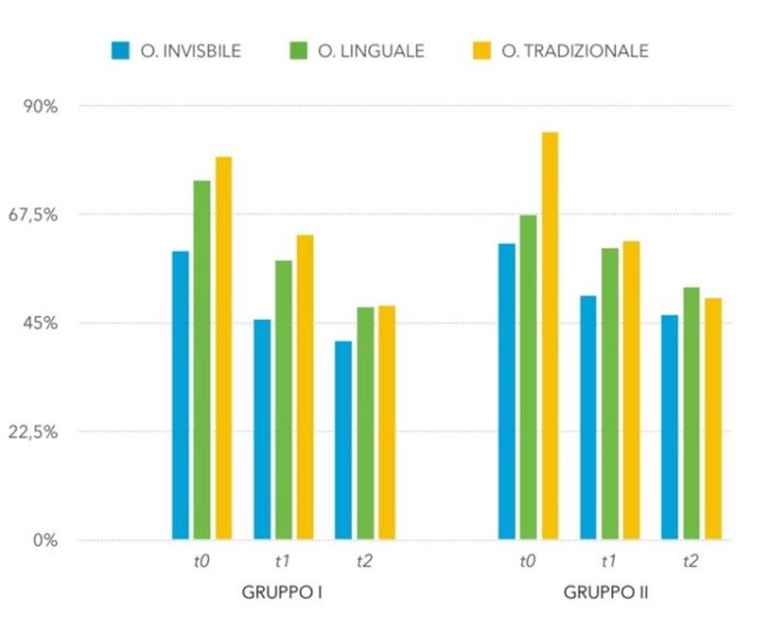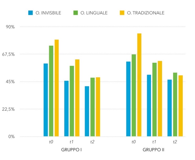 In particolare, nel caso dell’ortodonzia invisibile l’indice è diminuito nel gruppo I dal 59,76%, rilevato al tempo zero, al 41,23% rilevato invece dopo due mesi di trattamento. Entrambi i test statistici utilizzati (t di student e analisi della varianza) non hanno dimostrato una differenza significativa dei dati in un intervallo di confidenza al 95%, sia per il gruppo I che per il gruppo II. Per quanto concerne l’ortodonzia linguale, il gruppo I ha evidenziato un miglioramento di IP dal 74,52% al 48,21%, il gruppo II dal 67,24% al 52,37%. Non si è verificata una variazione statisticamente significativa con test t student, diverso invece il risultato ottenuto con analisi della varianza che ha dato significatività statistica. IP nei casi di ortodonzia tradizionale non ha dato significatività statistica per entrambi i test statistici utilizzati, nonostante un miglioramento medio da 79,37% a 48,61% nel gruppo I e da 84,56% a 50,09% nel gruppo II (Tabb. 1, 2). L’indice di sanguinamento ha anch’esso mostrato notevoli miglioramenti in tutti i tipi di ortodonzia studiata (Grafico 2).