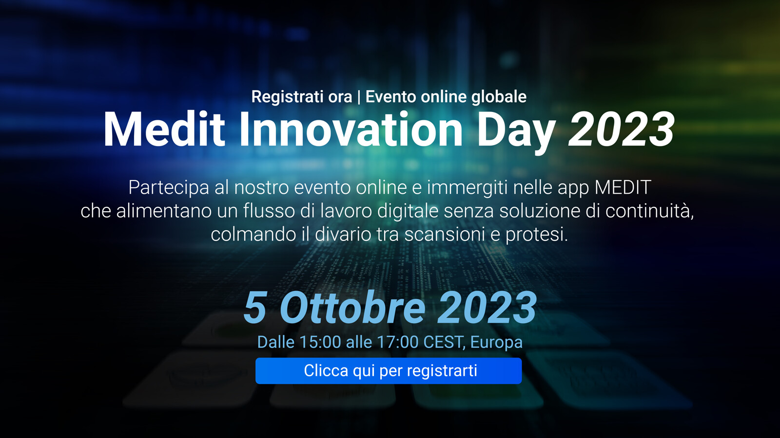 Il Medit Innovation Day 2023 è un evento online gratuito aperto a tutti i dentisti del mondo. Dato il prossimo lancio dell’app Medit ClinicCAD, Medit è orgogliosa di presentare un software CAD dentistico senza soluzione di continuità che consente agli odontoiatri di progettare in modo efficiente corone, ponti e otturazioni, sia provvisori che definitivi. L’innovativa soluzione del tipo “da scansione a progettazione” si integra con tecnologie avanzate di produzione 3D come la fresatura e la stampa 3D, segnando un passo significativo verso una soluzione per la protesi dentale semplificata.
