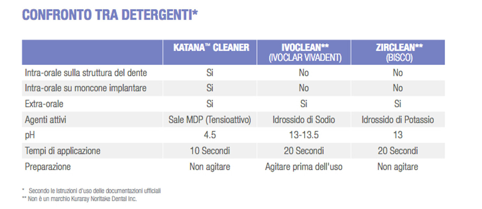 A differenza di altri detergenti dentali, KATANA Cleaner può essere utilizzato sia intraoralmente che extraoralmente, grazie al suo valore pH relativamente basso pari a 4,5.