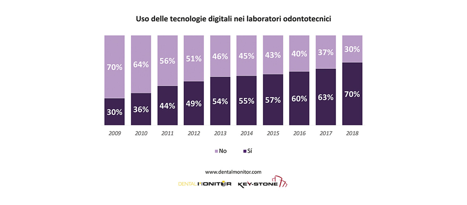 Ma da alcuni anni, i laboratori più evoluti, di maggiori dimensioni e fornitori di un numero elevato di studi, hanno iniziato a investire nelle tecnologie spingendo di fatto la digitalizzazione in ambito protesico, una diffusione di tecnologie che riguarda ormai oltre il 40% dei laboratori.
