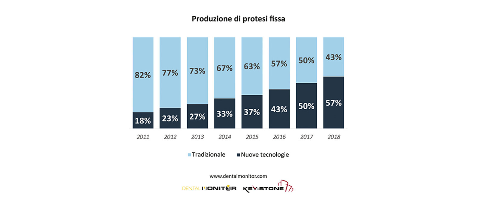 Nel settore dentale la domanda di protesi si prospetta come un’evoluzione radicale: nel 2018 quasi il 60% degli elementi in ceramica è stata realizzata attraverso tecniche digitali. Una crescita rilevante se consideriamo che nel 2011 la percentuale di protesi proveniente dai laboratori e realizzata con flusso digitale raggiungeva solo il 18% (Tab. 1).