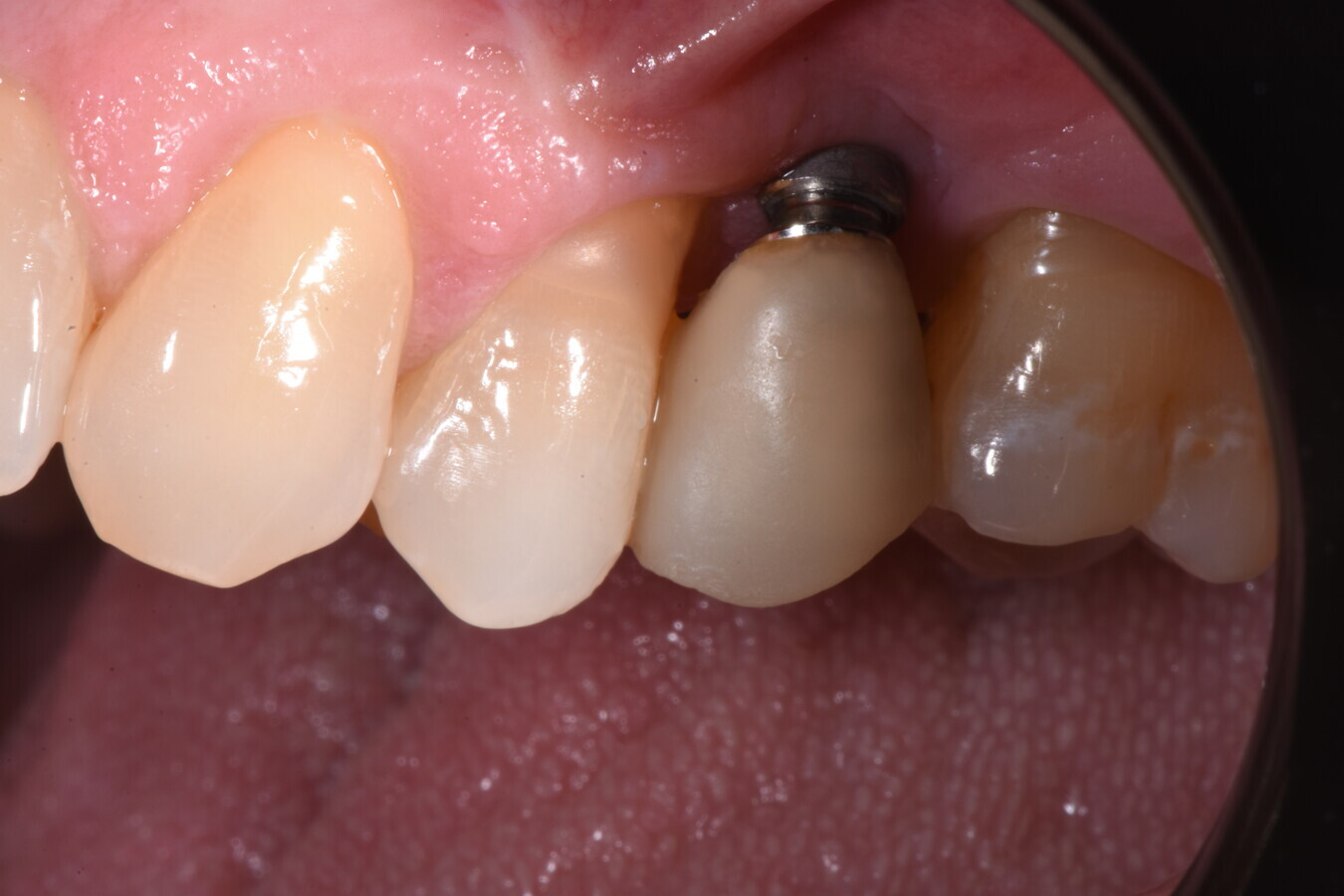 La paziente si presenta all’attenzione dello studio riferendo fastidi nella zona superiore sx, e all’anamnesi risultano trascorsi 3 anni dall’ultimo appuntamento di igiene presso altro centro. L’esame visivo e fotografico (Fig. 1) evidenziano un’alterazione dello stato dei tessuti perimplantari con sanguinamento spontaneo e lassità del tessuto molle, pertanto segue acquisizione di rx endorale da parte dell’odontoiatra (Fig. 2) da cui risulta un’importante riassorbimento osseo a carico dell’impianto. Segue un sondaggio perimplantare profondo (Fig 3), eseguito previa anestesia topica con Lidocaina 15%, per definire estensione e conformazione del difetto associandolo alla valutazione radiografica per la conta delle spire esposte.