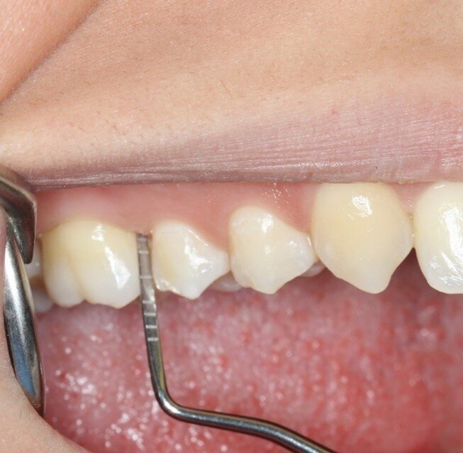 A una settimana dall’applicazione, i pazienti riferiscono una riduzione significativa di sanguinamento e sensibilità gengivale, con risultati superiori rispetto alla sola pulizia professionale. Nei casi di gengivite e tasche parodontali fino a 3 mm, UBIGEL INPERIO ha dimostrato di favorire una parziale o completa regressione dell’infiammazione, contribuendo al ripristino dell’attacco epiteliale e all’eliminazione del sanguinamento grazie alla sua azione antibatterica mirata. Nella Figura 1 è mostrata la situazione iniziale del paziente prima del trattamento.Dopo una settimana dall’applicazione di Ubigel Inperio (Fig. 2), si osservano i primi miglioramenti clinici. Il sondaggio pre-trattamento, effettuato sette giorni dopo l’igiene professionale, evidenziava una profondità di 3 mm con presenza di sanguinamento gengivale (Fig. 3). A distanza di 21 giorni dal trattamento, il sondaggio mostra una profondità della tasca inferiore a 2 mm e l’assenza di sanguinamento, segno di un netto miglioramento dello stato gengivale (Fig. 4).