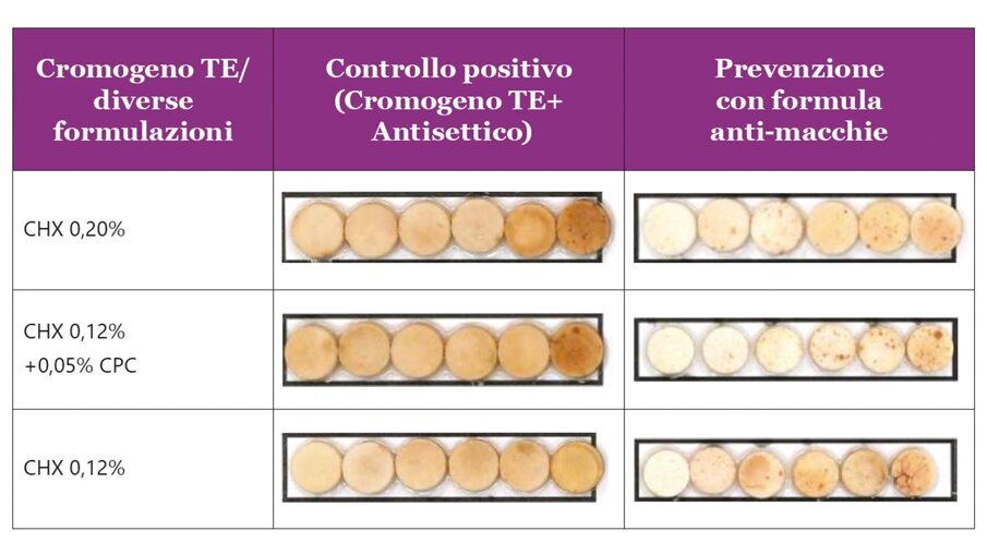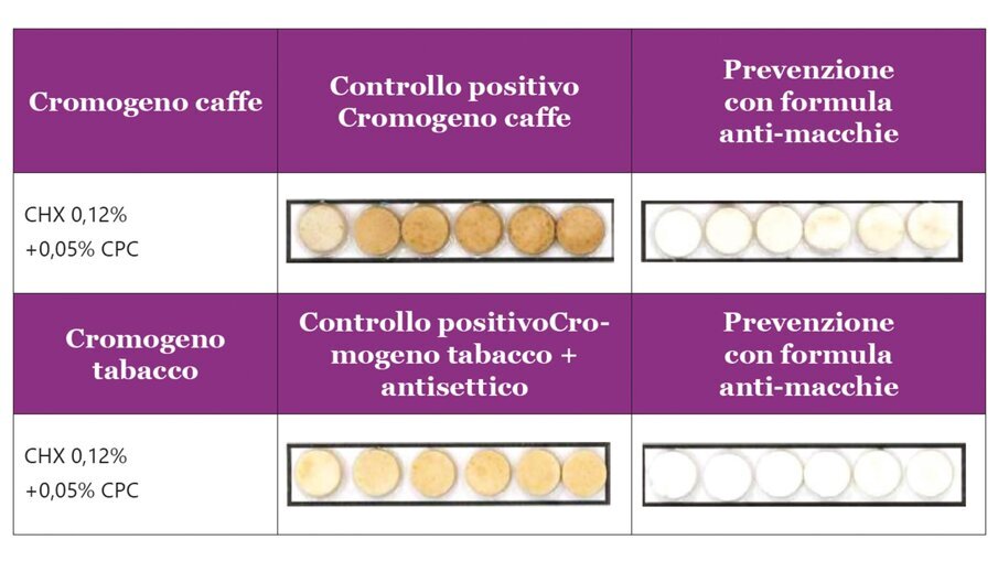 Lo scopo di questo studio è stato dimostrare che una nuova formulazione di dentifricio, con esametafosfato di sodio, una bassa concentrazione di tensioattivi e senza perlite, previene e riduce efficacemente le macchie causate da vari collutori contenenti clorexidina (CHX) o cloruro di cetilpiridinio (CPC) in presenza di diversi cromogeni alimentari (te, caffè etc.) e del tabacco.