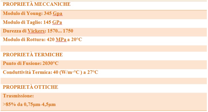 Le caratteristiche dello zaffiro includono:Lo zaffiro è un cristallo trasparente formato da ossido di alluminio (Al2O3), anisotropo. Il materiale può essere costruito in diversi modalità così da poter sfruttare le sue peculiari proprietà, particolarmente quelle ottiche5.