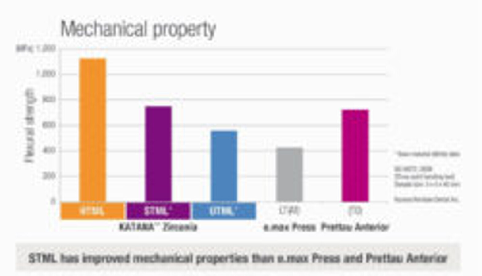 “ML” sta per “multistrato” e il livello cromatico e di saturazione diminuiscono dallo strato cervicale a quello incisale. Il mercato ha risposto molto bene ai dischi policromatici; quindi Kuraray Noritake Dental ha compiuto il passo successivo. Nel 2015, la famiglia KATANA è cresciuta con l'introduzione di due nuovi materiali traslucidi: KATANA Zirconia STML (super traslucente) e UTML (ultra traslucente). Studi di traslucenza hanno rivelato l’altissima trasmissione della luce di KATANA Zirconia UTML (43%) e STML (38%). Va notato che la resistenza del materiale diminuisce con l'aumentare della traslucenza.