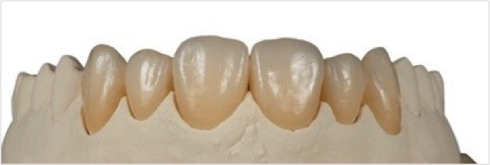 Con lo scopo di un lavoro fantasma, abbiamo utilizzato KATANA UTML per produrre faccette a tutto tondo. Le faccette sottilissime sono state fresate con uno spessore minimo di 0,3 mm. Nonostante la sottigliezza dello strato, non c’erano fratture o scheggiature ai bordi. La caratterizzazione individuale è stata ottenuta attraverso la tecnica di colorazione. Le faccette fresate mostrano una bellissima trasparenza. Per esaltare le proprietà ottiche in modo perfetto, può essere utilizzato un cemento adesivo come PANAVIA V5 di Kuraray Noritake Dental per restauri così delicati.